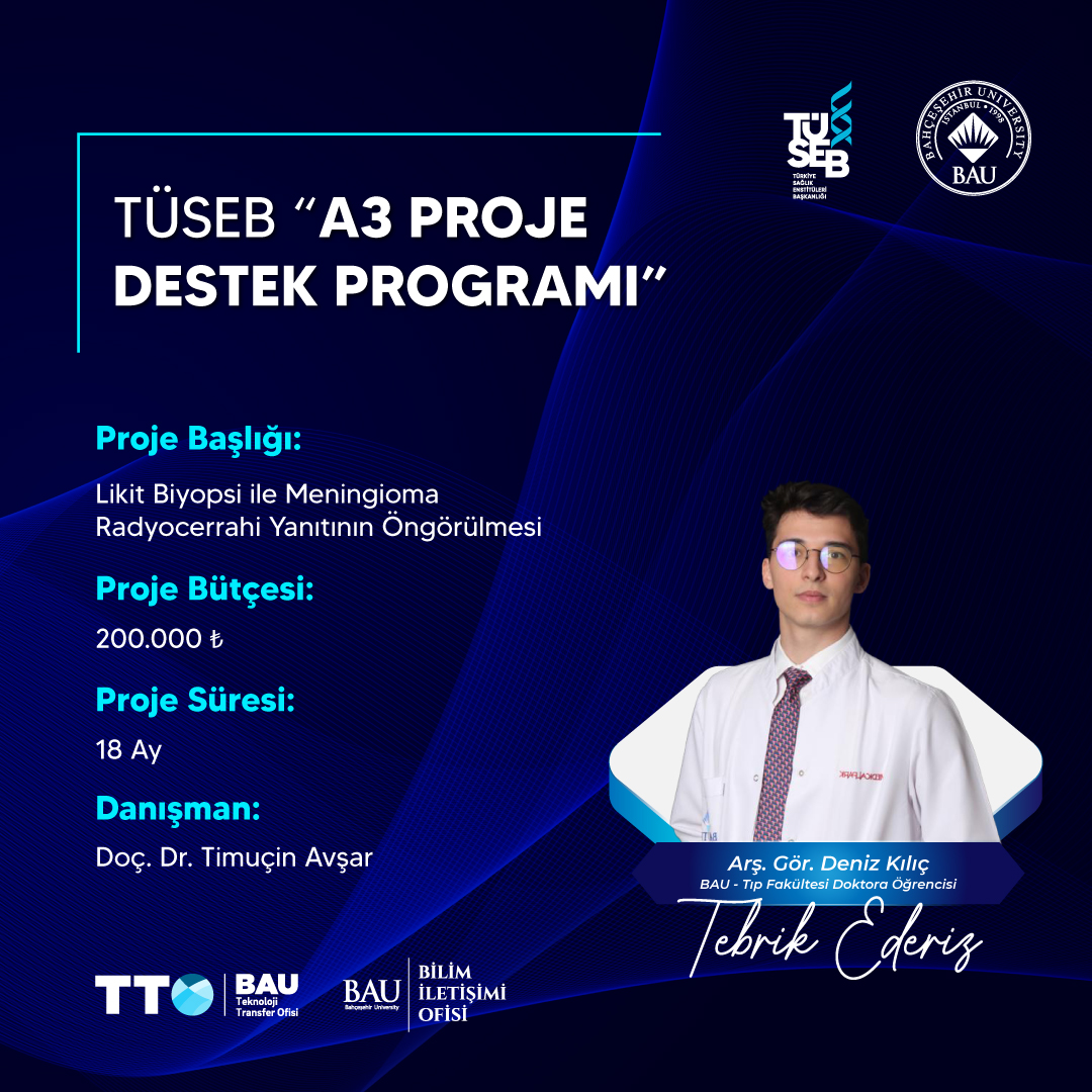 BAU Tıp Fakültesinden akademisyenimiz Doç. Dr. Timuçin Avşar’ın danışmanlığında Tıp Fakültesi doktora öğrencimiz Arş. Gör. Deniz Kılıç’ın “Likit Biyopsi ile Meningioma Radyocerrahi Yanıtının Öngörülmesi” isimli 200.000 TL bütçeli projesi 18 ay süre ile desteklenmeye hak kazandı.