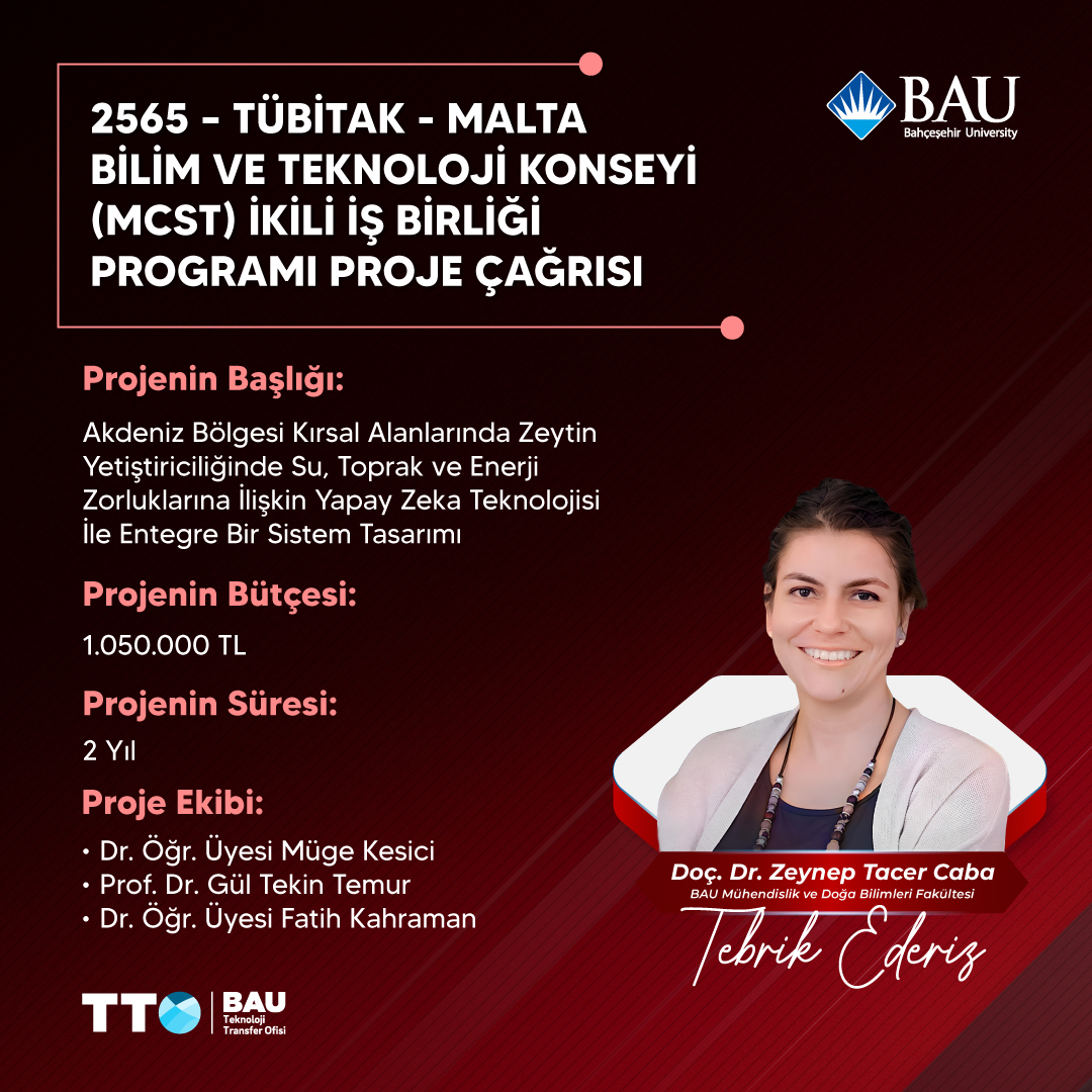 BAU Mühendislik ve Doğa Bilimleri Fakültesi Akademisyenimiz Doç. Dr. Zeynep Tacer Caba’nın yürütücü olduğu, proje ekibinde Dr. Öğr. Üyesi Müge Kesici, Prof. Dr. Gül Tekin Temur ve Dr. Öğr. Üyesi Fatih Kahraman’ın bulunduğu “Akdeniz Bölgesi Kırsal Alanlarında Zeytin Yetiştiriciliğinde Su, Toprak ve Enerji Zorluklarına İlişkin Yapay Zeka Teknolojisi ile Entegre Bir Sistem Tasarımı” başlıklı, 1.050.000 TL bütçeli proje 2 yıl süre ile desteklenmeye hak kazanmıştır.