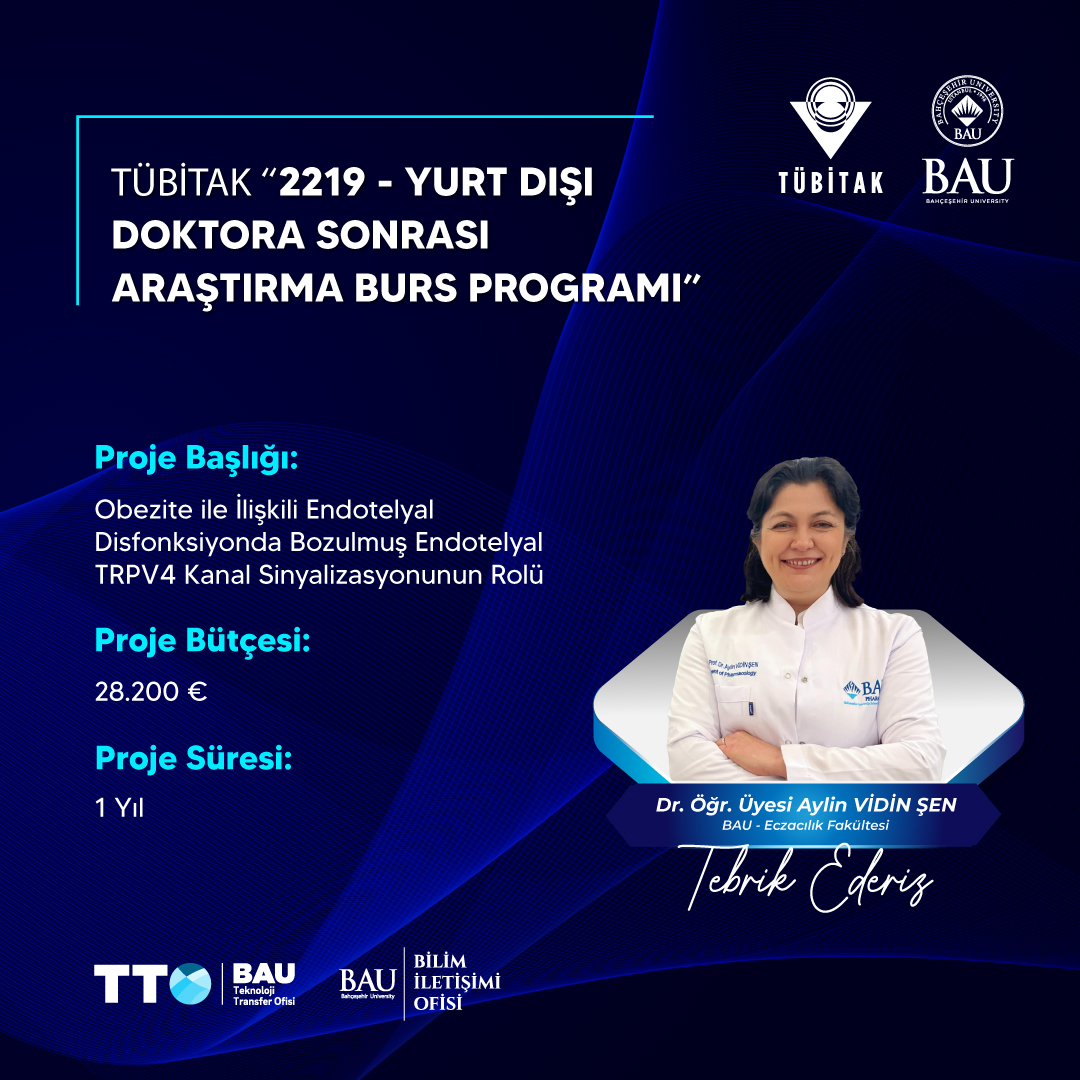 BAU Eczacılık Fakültesinden akademisyenimiz Dr. Öğr. Üyesi Aylin Vidin Şen’in “Obezite ile İlişkili Endotelyal Disfonksiyonda Bozulmuş Endotelyal TRPV4 Kanal Sinyalizasyonunun Rolü” isimli 28.200 EUR (Euro) bütçeli projesi 1 yıl süre ile desteklenmeye hak kazandı.
