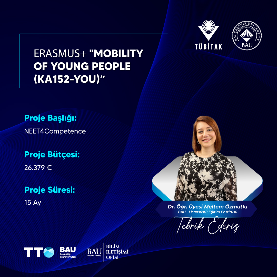 BAU Lisansüstü Eğitim Enstitüsü Müdür Yardımcısı Dr. Öğr. Üyesi Meltem ÖZMUTLU‘nun “NEET4Competence” isimli 26.379 Euro bütçeli projesi 15 ay süre ile desteklenmeye hak kazandı.