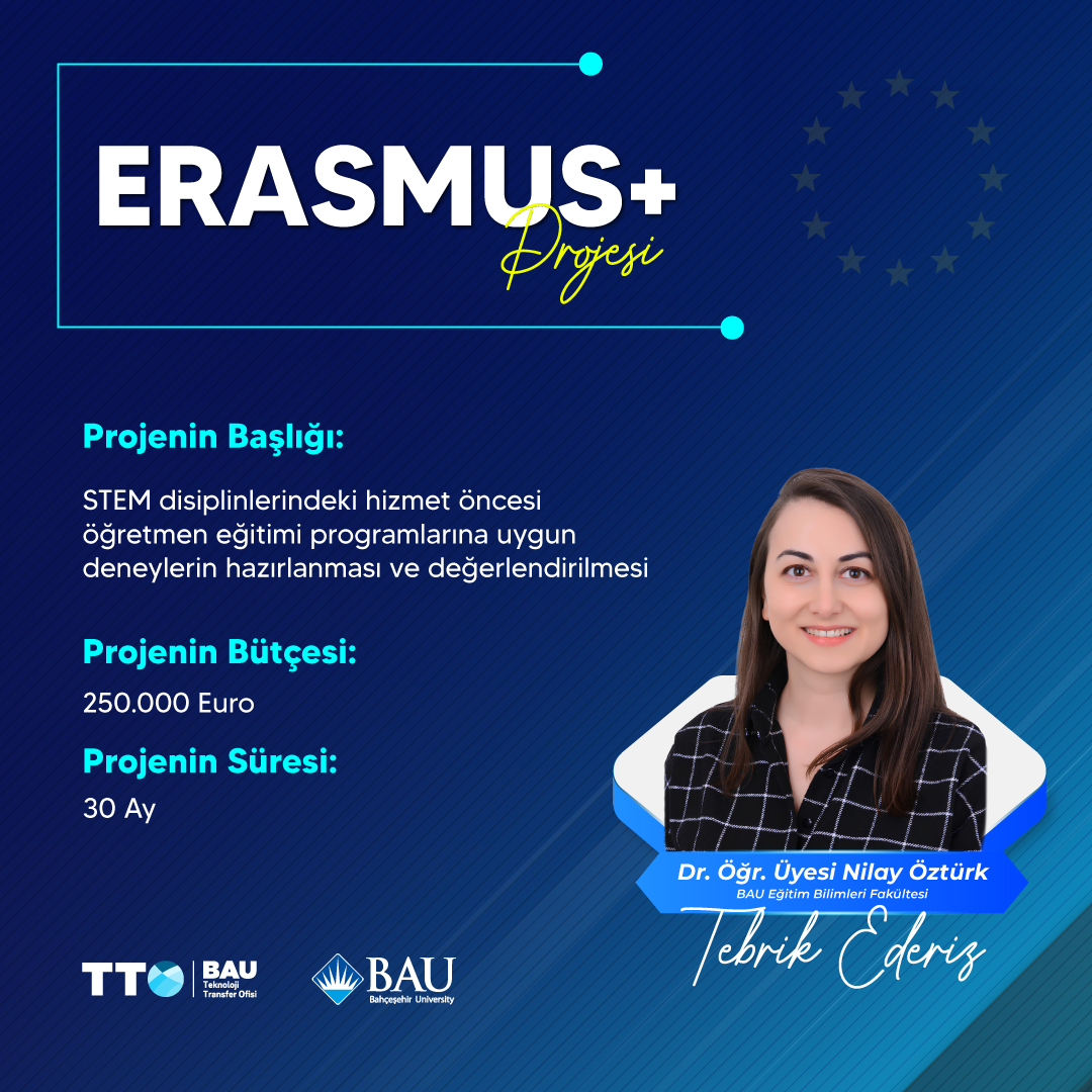 BAU Eğitim Bilimleri Fakültesi Akademisyenimiz Dr. Öğr. Üyesi Nilay Öztürk’ün yürütücüsü olduğu, “STEM disiplinlerindeki hizmet öncesi öğretmen eğitimi programlarına uygun deneylerin hazırlanması ve değerlendirilmesi” başlıklı, 250.000 EURO bütçeli proje 30 Ay süre ile desteklenmeye hak kazandı.