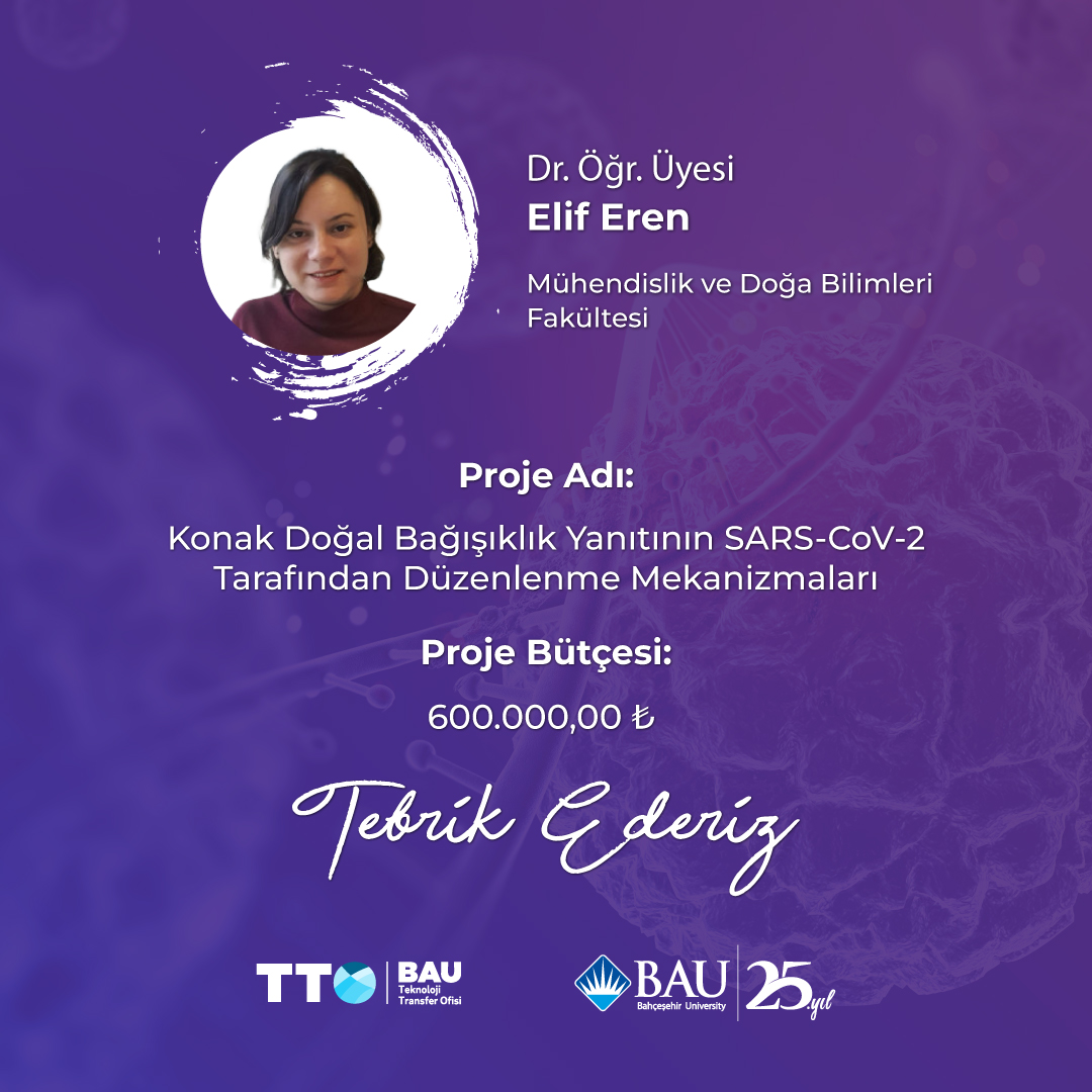 BAU Mühendislik ve Doğa Bilimleri Fakültesi Akademisyenimiz Dr. Öğr. Üyesi Elif Eren’in Konak Doğal Bağışıklık Yanıtının SARS-CoV-2 Tarafından Düzenlenme Mekanizmaları isimli 600.000,00 TL bütçeli projesi desteklenmeye hak kazandı