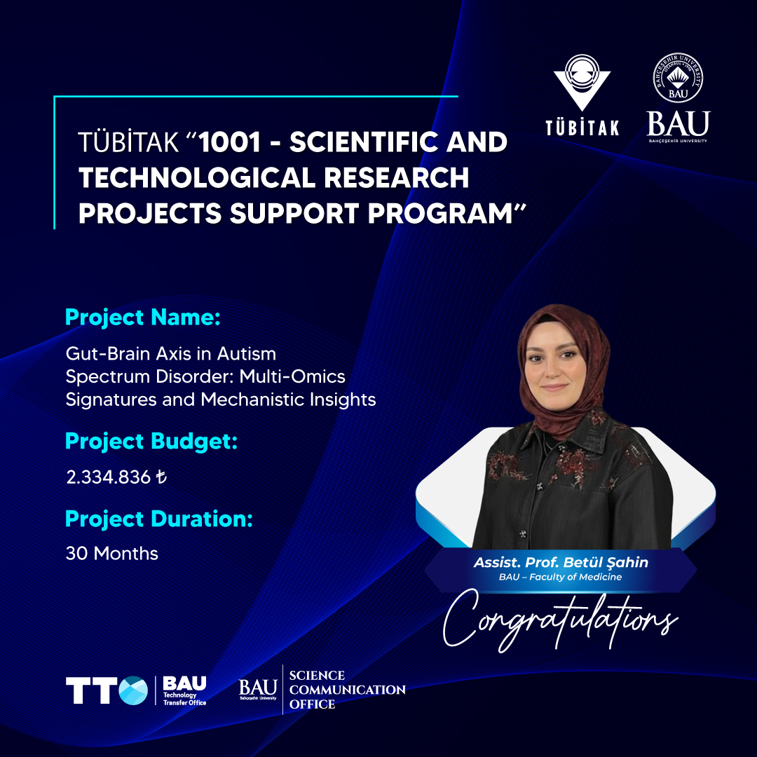 The project titled “Gut-Brain Axis in Autism Spectrum Disorder: Multi-Omics Signatures and Mechanistic Insights”, led by faculty member Assist. Prof. Betül Şahin from Faculty of Medicine in BAU, with a budget of 2.334.836 TL and a duration of 30 months, has been awarded support.