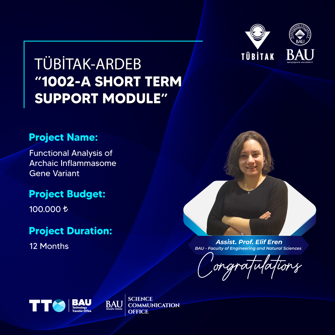 Our faculty member from BAU Faculty of Engineering and Natural Sciences, Assist. Prof. Elif Eren’s project “Functional Analysis of Archaic Inflammasome Gene Variant” has been awarded support for a duration of 12 months with a budget of 100.000 TL