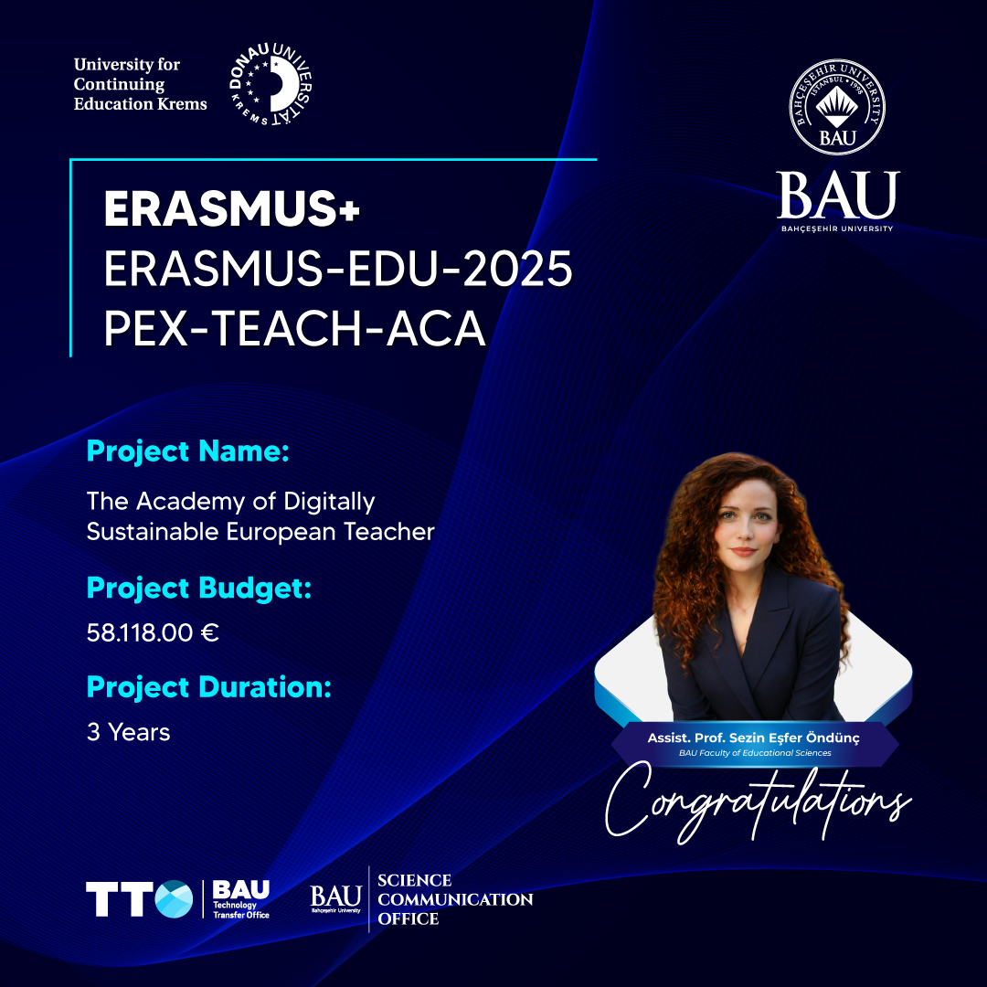 The project titled “The Academy of Digitally Sustainable European Teacher”, led by Assist. Prof. Sezin Eşfer Öndünç from BAU Faculty of Educational Sciences with a budget of 58.118.00 € and a duration of 3 years, has been awarded support.