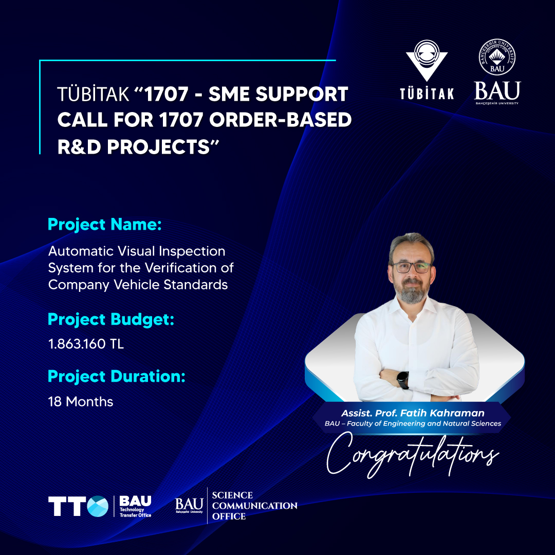 The project titled “Automatic Visual Inspection System for the Verification of Company Vecihle Standarts”, led by faculty member Assist. Prof Fatih Kahraman from Faculty of Engineering and Natural Sciences in BAU, with a budget of 1.863.160 TL and a duration of 18 months has been awarded support.