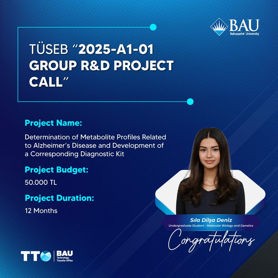 Under the supervision of Dr. Betül Şahin, faculty member at the Faculty of Medicine, the project titled “Identification of Metabolite Profiles Related to Alzheimer’s Disease and the Development of a Corresponding Diagnostic Kit” by Sıla Dilşa Deniz, a Molecular Biology and Genetics student at the Faculty of Engineering and Natural Sciences at Bahçeşehir University, has been awarded support for a duration of 12 months with a budget of 50,000 TL.