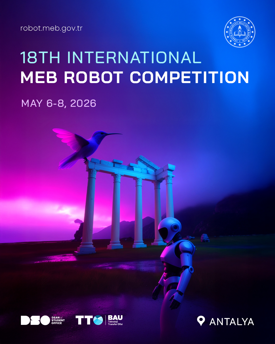 Organized by the Ministry of National Education of the Republic of Türkiye, the 18th International MEB Robot Competition will be held in Antalya on 06–08 May 2026 under the theme “Green Homeland, Blue Future.”