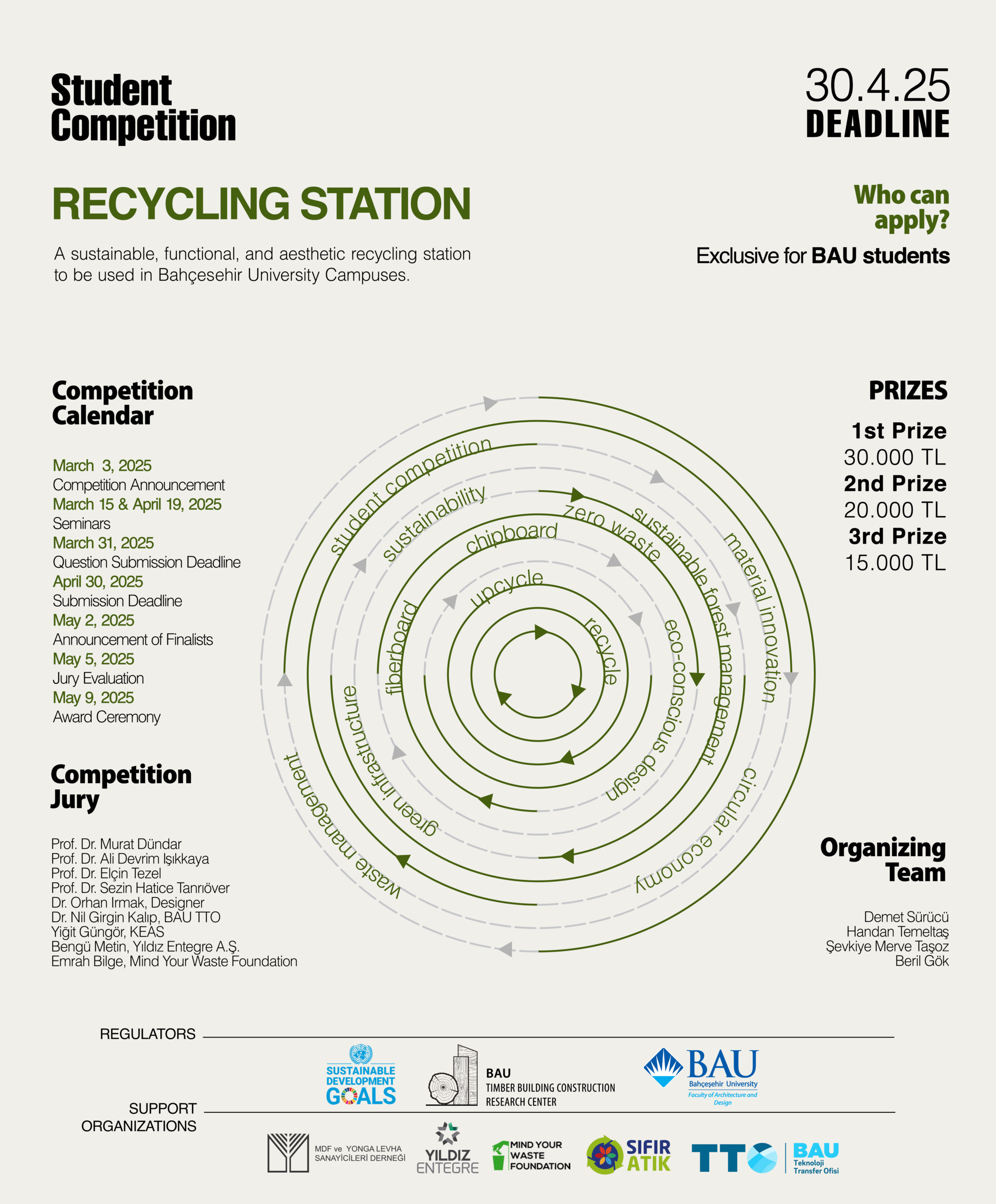 BAU Ahşap Yapı Uygulama ve Araştırma Merkezi ve BAU Mimarlık ve Tasarım Fakültesi’nin birlikte düzenlediği “Geri Dönüşüm İstasyonu’’ Tasarımı Öğrenci yarışmasını size duyurmaktan mutluluk duyarız.