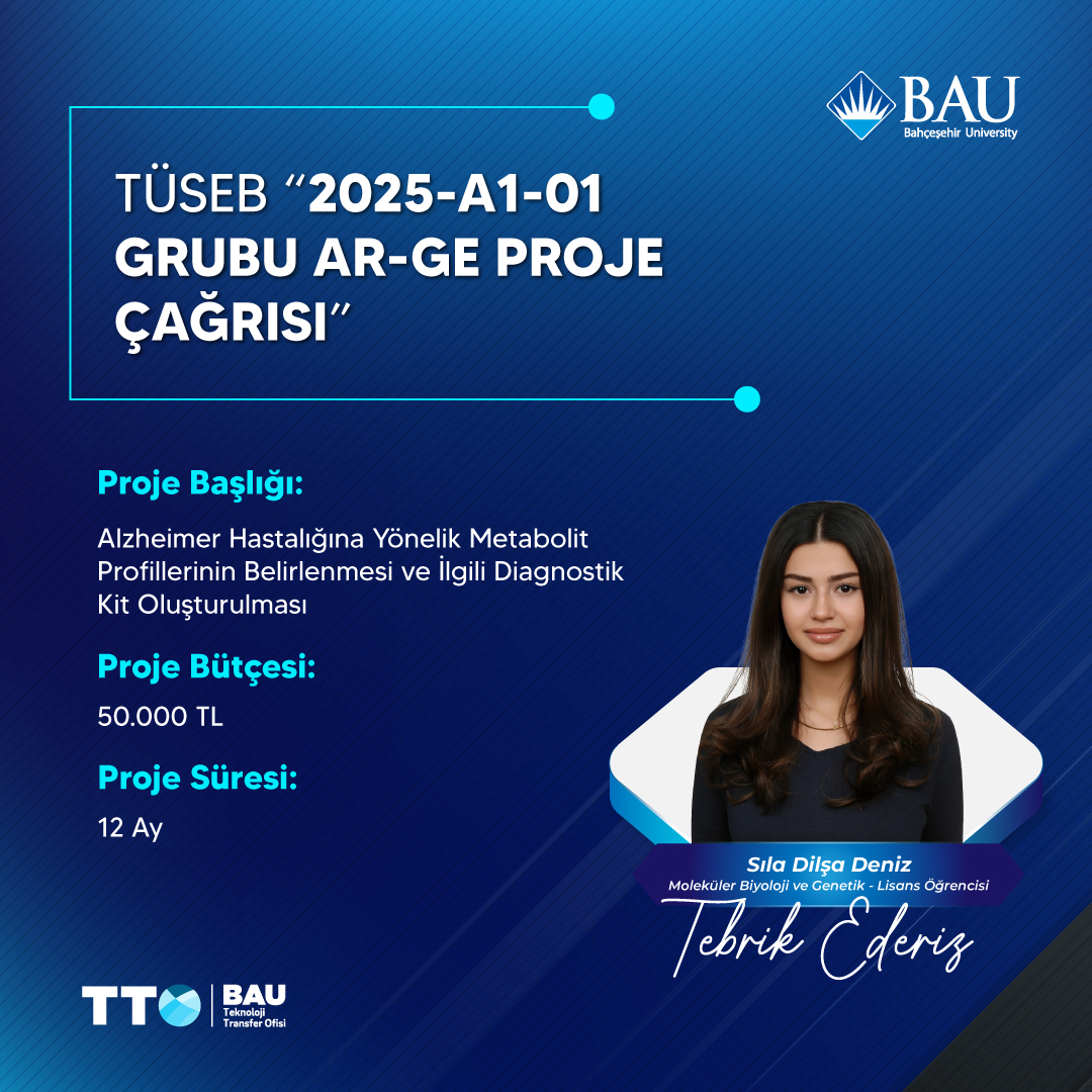 Bahçeşehir Üniversitesi Tıp Fakültesi akademisyenimiz Dr. Öğr. Üyesi Betül Şahin‘in danışmanlığında, Mühendislik ve Doğa Bilimleri Fakültesi Moleküler Biyoloji ve Genetik öğrencisi Sıla Dilşa Deniz’in “Alzheimer Hastalığına Yönelik Metabolit Profillerinin Belirlenmesi ve İlgili Diagnostik Kit Oluşturulması” isimli 50.000 TL bütçeli projesi 12 ay süre ile desteklenmeye hak kazanmıştır.