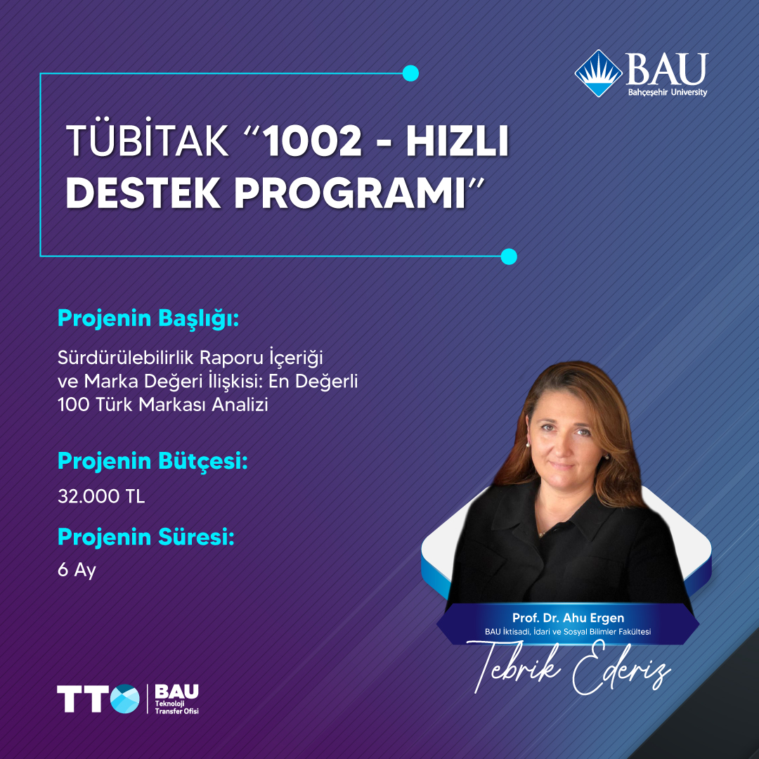 BAU İktisadi, İdari ve Sosyal Bilimler Fakültesi akademisyenimiz Prof. Dr. Ahu Ergen’in proje yürütücüsü olduğu “Sürdürülebilirlik Raporu İçeriği ve Marka Değeri İlişkisi: En Değerli 100 Türk Markası Analizi” isimli 32.000  TL bütçeli proje 6 ay süre ile desteklenmeye hak kazandı.