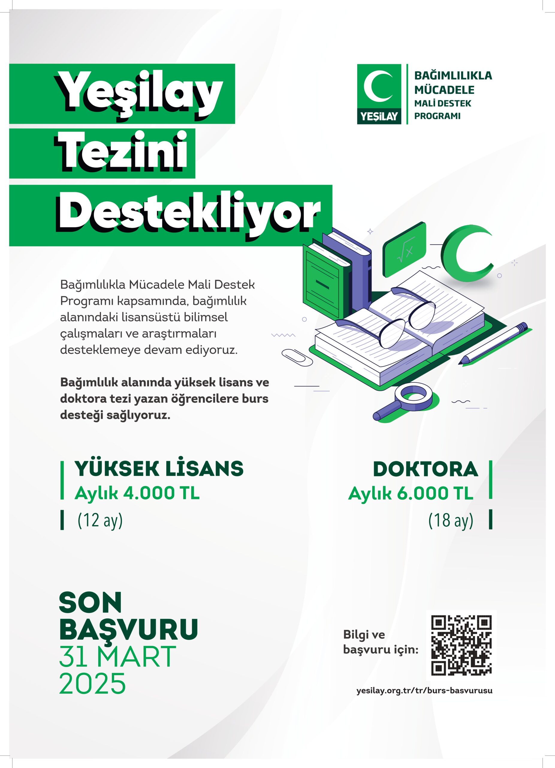 Yeşilay, üniversitelerde, enstitülerde ve araştırma alkol, tütün-sigara, uyuşturucu madde, kumar ve teknoloji bağımlılığı ile ilgili tez çalışması yapacak ve Yeşilay’ın bağımlılık çalışma alanlarına katkıda bulunacak yüksek lisans, doktora ve tıpta uzmanlık öğrencilerine burs desteği sağlıyor.