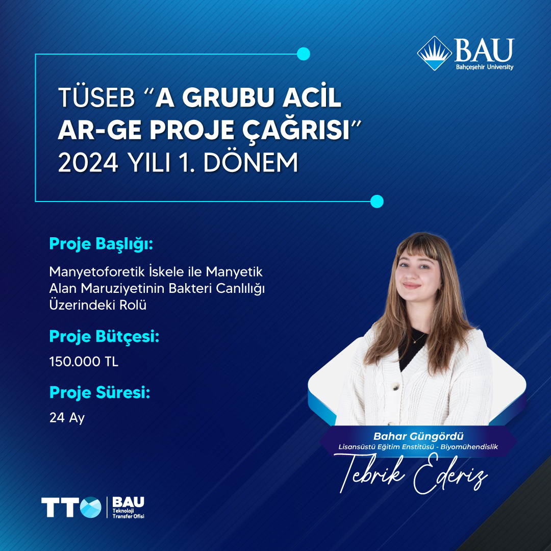 BAU Lisansüstü Eğitim Enstitüsü Biyomühendislik öğrencisi Bahar Güngördü’nün “Manyetoforetik İskele ile Manyetik Alan Maruziyetinin Bakteri Canlılığı Üzerindeki Rolü” isimli 150.000 TL bütçeli projesi desteklenmeye hak kazanmıştır.